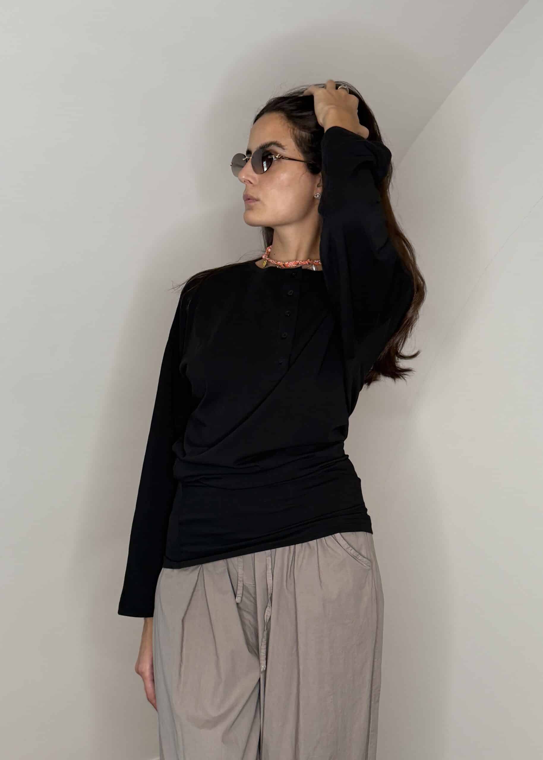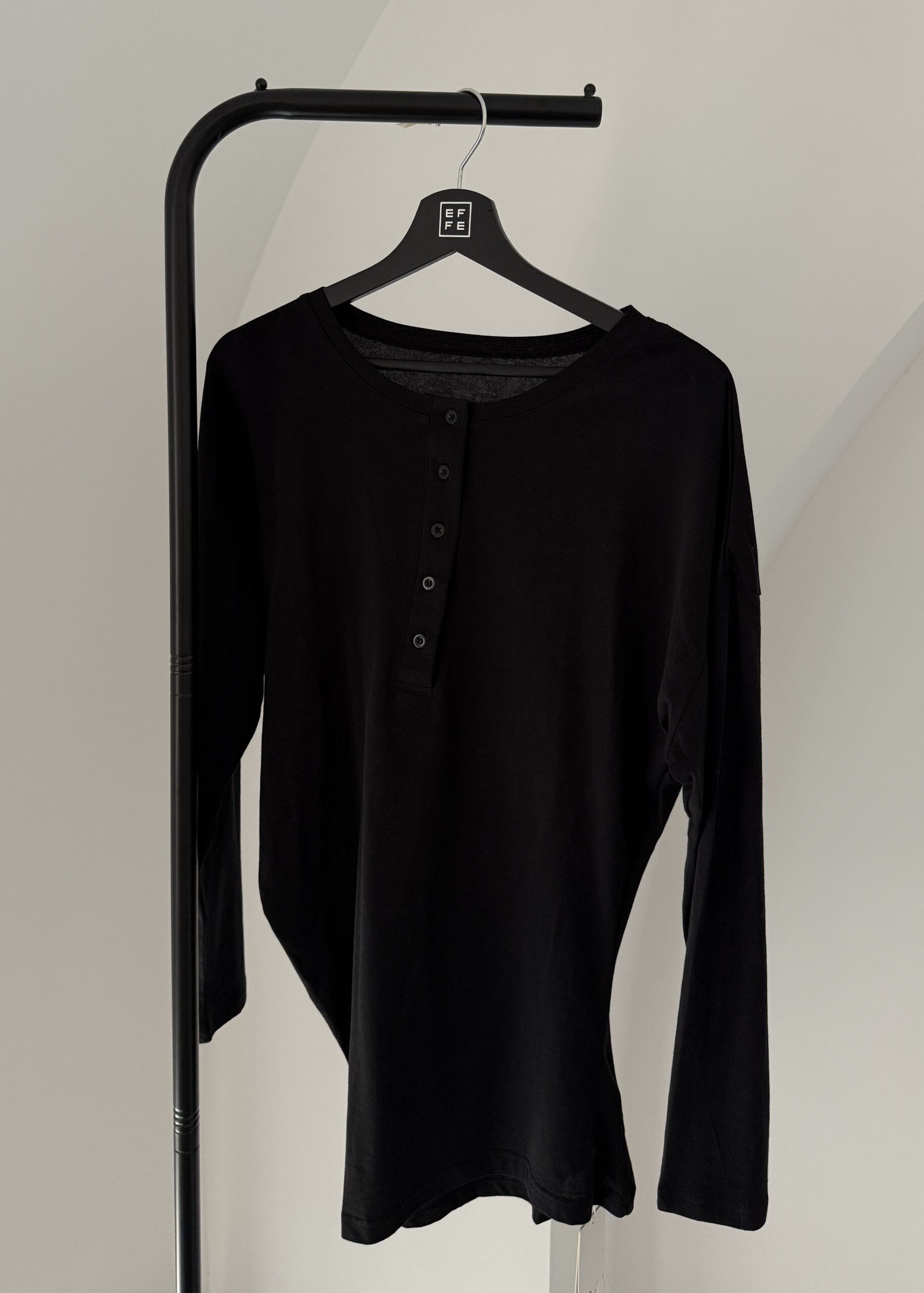 maglietta nera in cotone manica lunga e bottoncini sulla parte anteriore. avvitata sulla parte finale